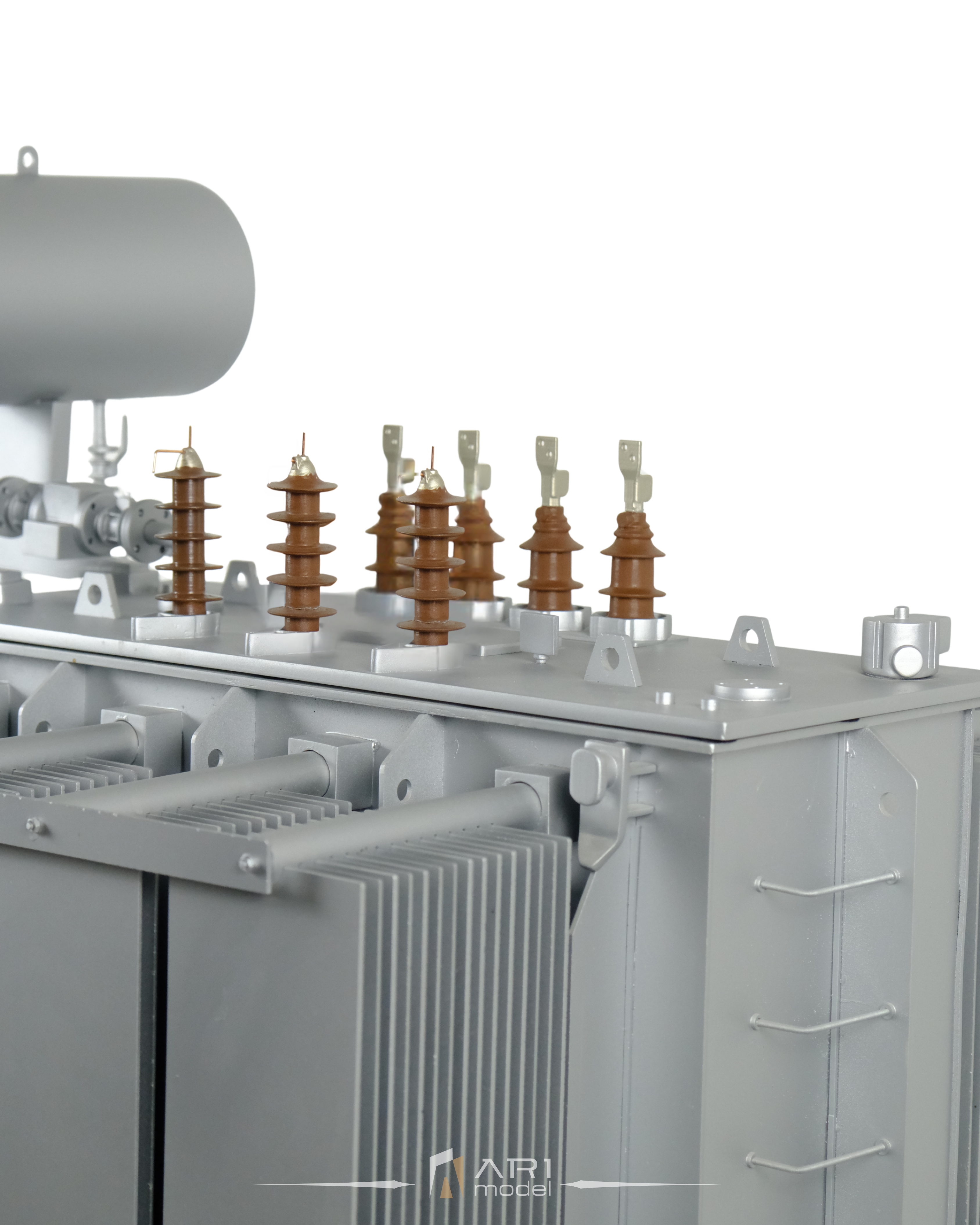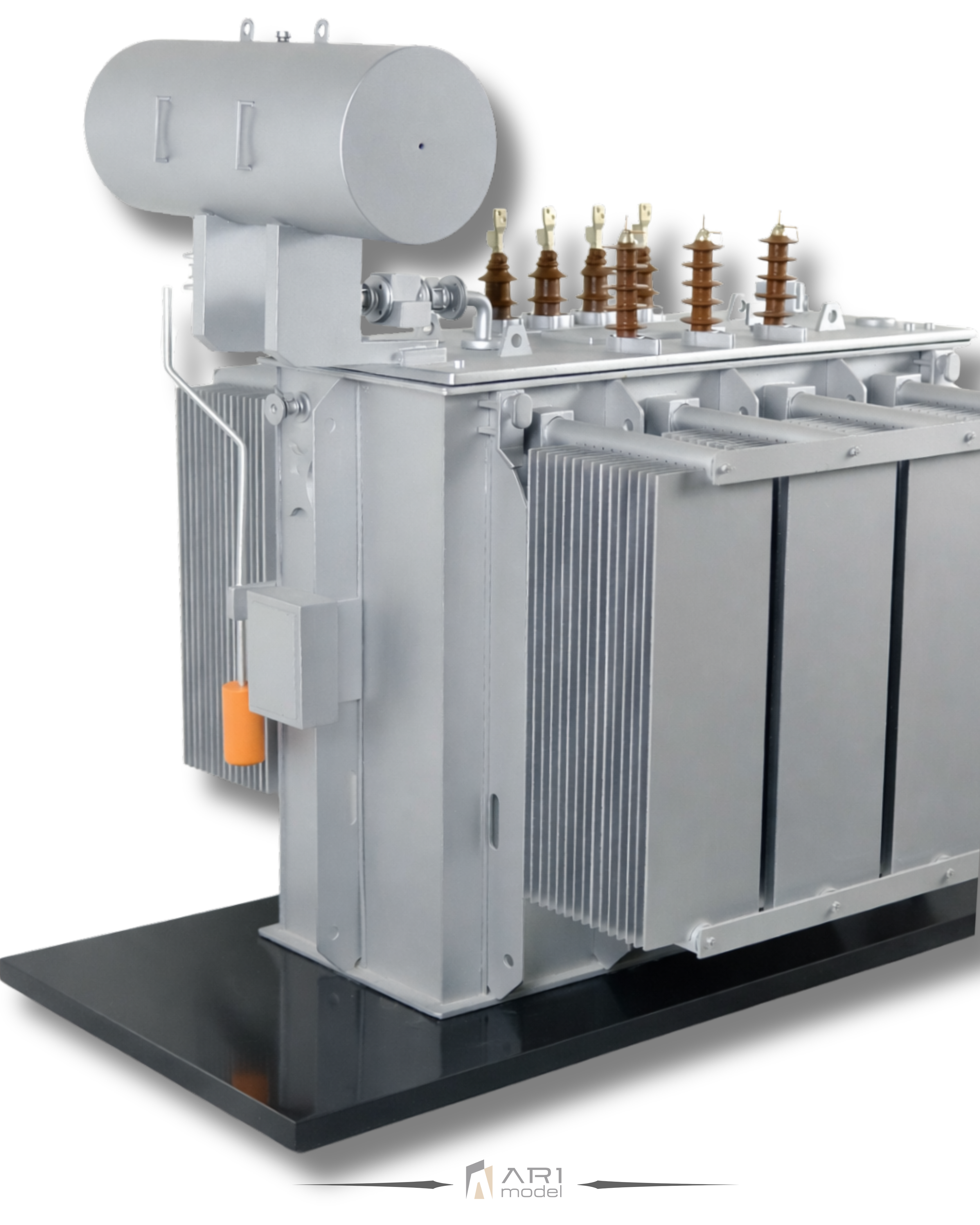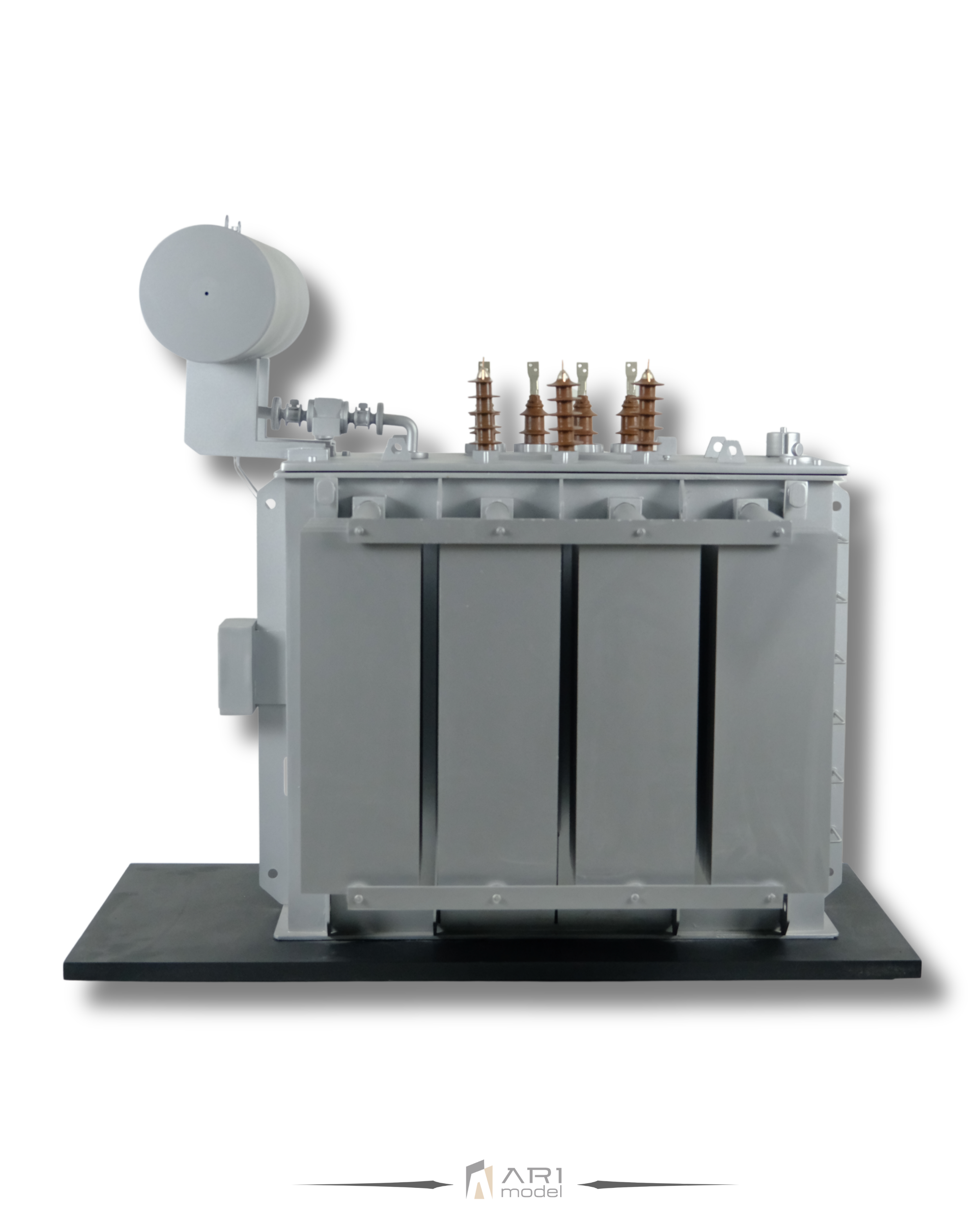 Cada componente del modelo de transformador desarrollado por ARI Maquette se basa en referencias técnicas reales. Desde paneles de refrigeración y aisladores hasta proporciones estructurales, cada detalle refleja la lógica del diseño industrial.